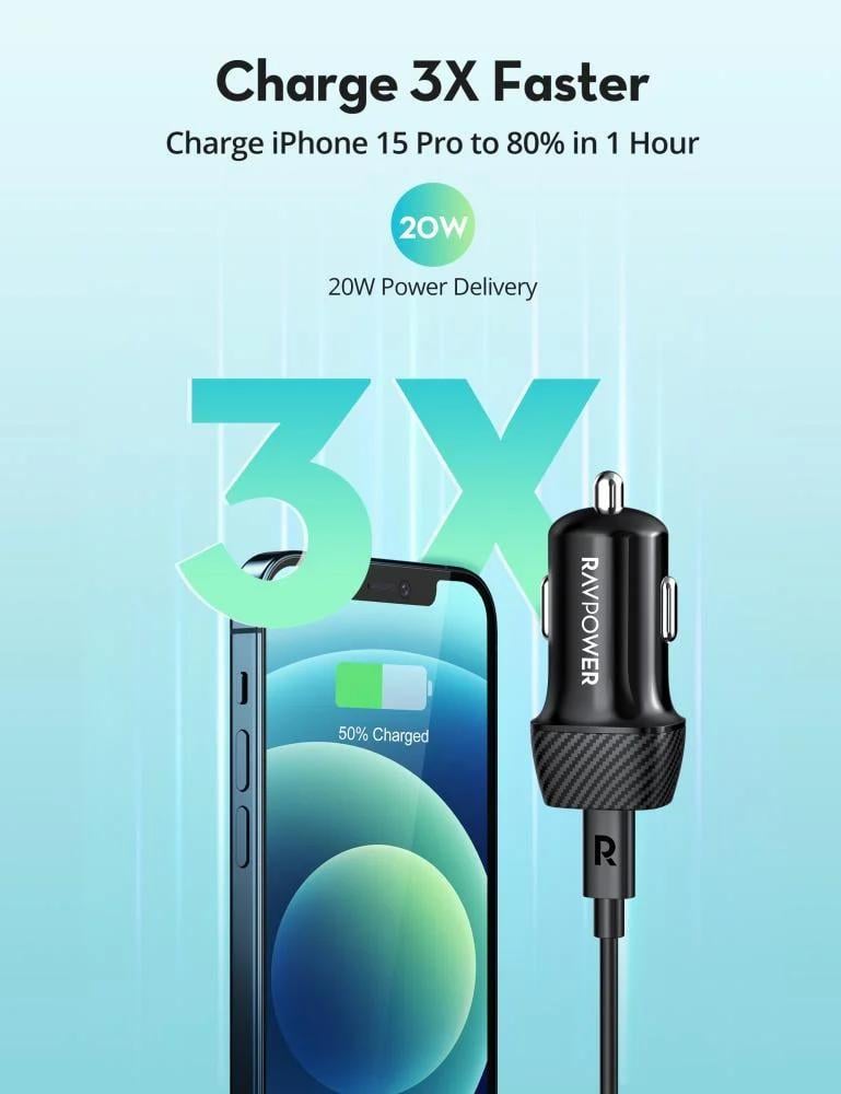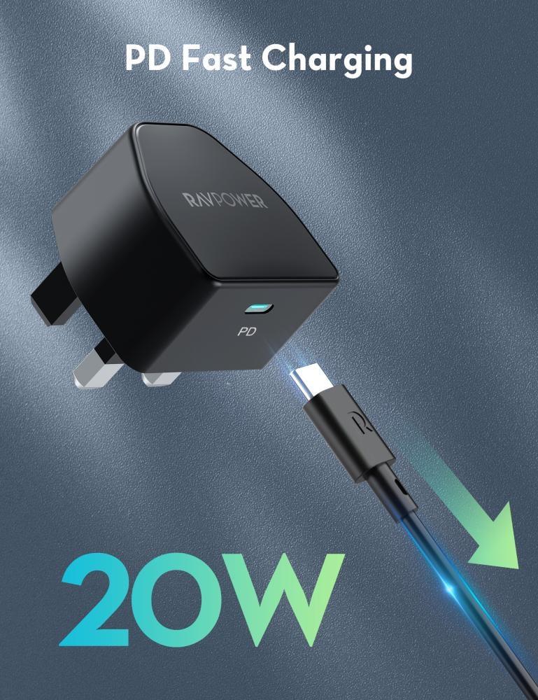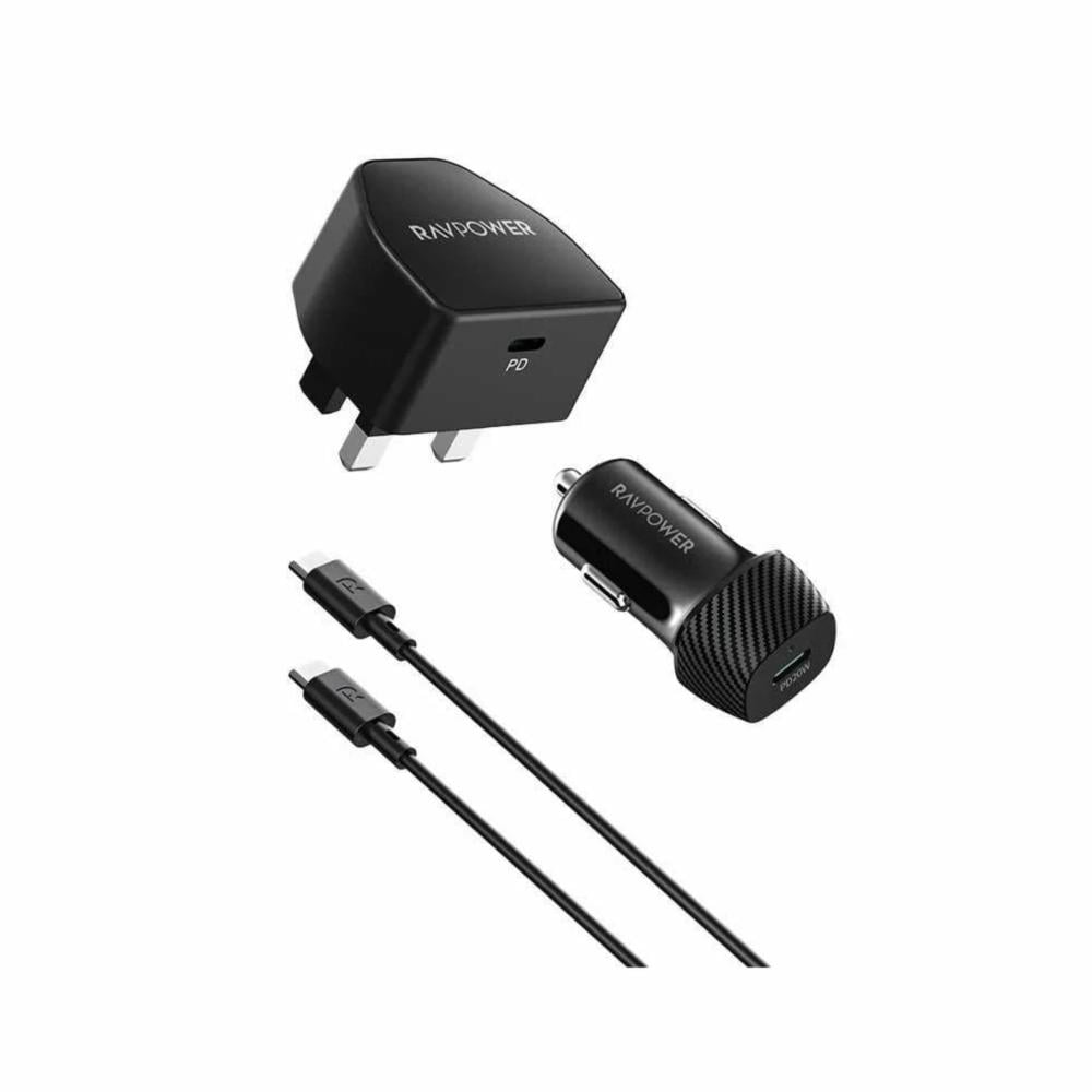 راف بور - بكج 3*1 كومبو شاحن جدارى بقوة 20 واط بمنفذ تايب سي + شاحن سيارة بقوة 20 واط بمنفذ تايب سي + سلك تايب سي الى تايب سي 1 متر